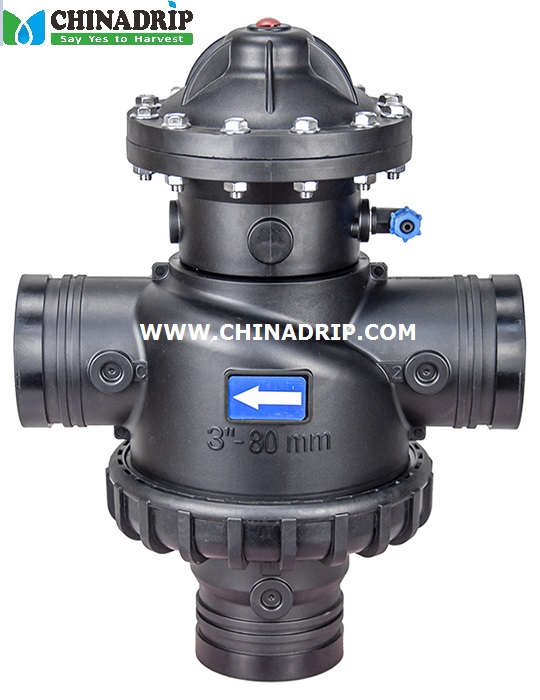 1. que é combinada por vários Esta válvula é uma válvula hidráulica de 3 vias em forma de T com câmara dupla, operada hidraulicamente e acionada por diafragma, que é adequada para vários retrolavagem automática de sistemas de filtração.